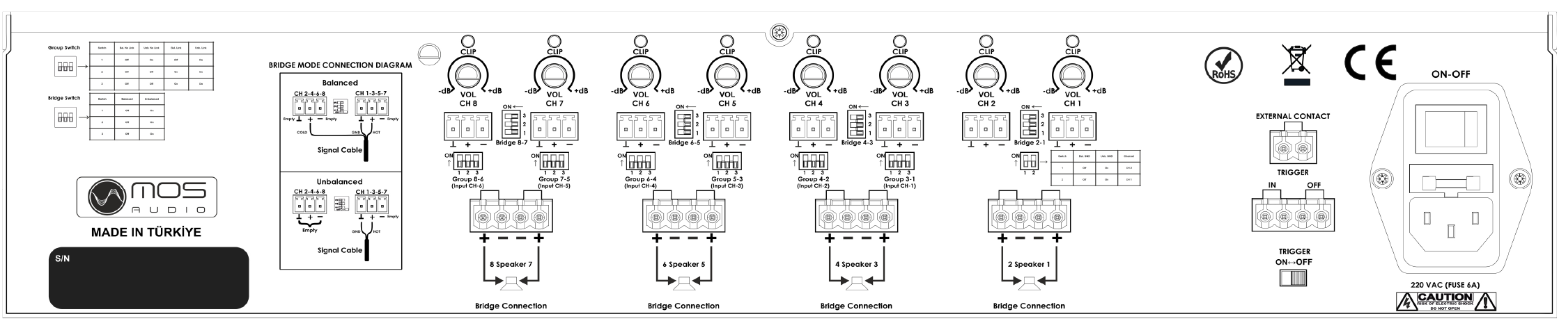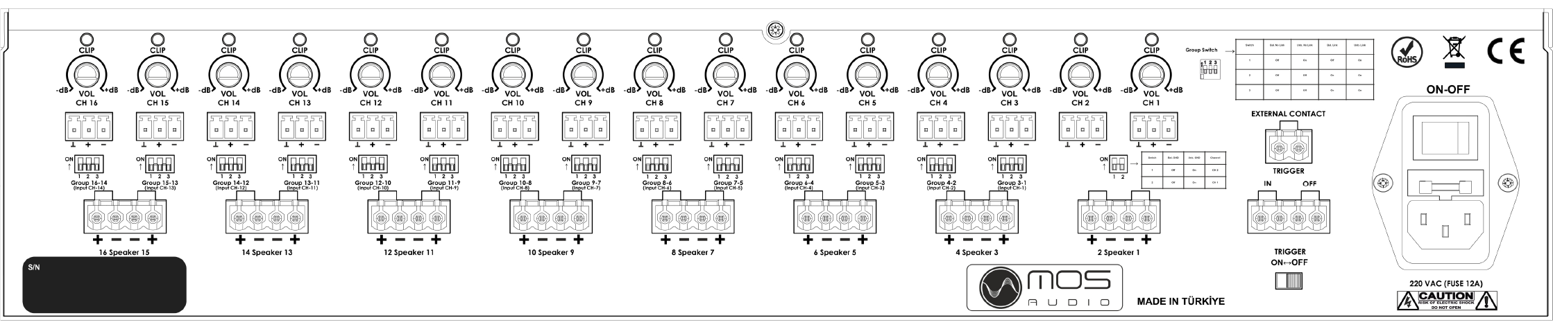MOS AUDIO CAB 1610 - CAB 810, profesyonel 16 kanallı Class-AB güç amplifikatörüdür. Ayrıca CAB 1610 - CAB 810 ön yükselteç (Pre Amplifikatör) katına sahiptir. Bu özelliği ile kaynaklar doğrudan bağlanabilir.